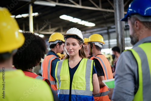 Obraz premium A confident, beautiful Caucasian woman worker stands among the male workers wearing safety uniform are meeting morning talk before the start of work in heavy industrial manufacturer factory.