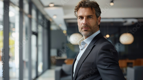 Naklejka premium A confident businessman in a suit standing in his office.