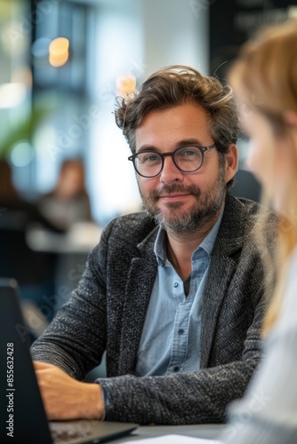 © Sunshine, Fototapeta premium A confident businessman with glasses working on a laptop in a contemporary office environment, engaging in a conversation.