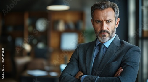 Fototapeta premium A confident man in a tailored suit stands with arms crossed in a chic office...