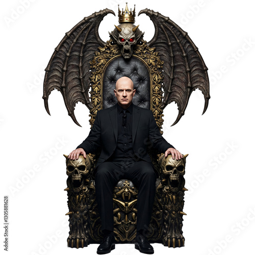 © Evil, Obraz premium A confident man in an austere suit sits on a large demonic rich throne