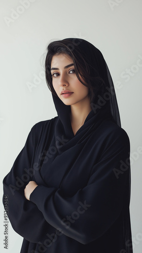 Fototapeta premium A confident woman in a black abaya stands with her arms crossed, gazing directly at the camera, exuding strength, modesty, and empowerment in her traditional attire.