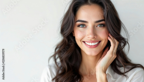 Fototapeta premium A confident woman in a white blouse smiles warmly against a clean,...