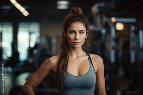 Fototapeta premium A confident woman stands in a well-equipped gym with her hands on her hips,...