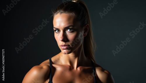 Fototapeta premium A confident woman with a determined expression, showcasing strength and athleticism in a portrait against a dark background.
