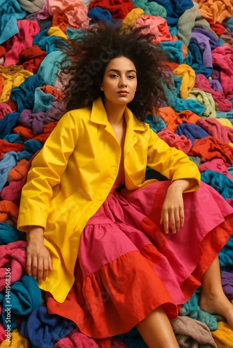 Fototapeta premium A confident woman with voluminous, wild hair wearing a vibrant yellow raincoat over a bold, voluminous pink and red skirt, seated amidst a chaotic, yet artistic pile of colorful clothes.
