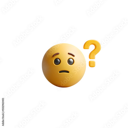 © Ahmad, Fototapeta premium A confused yellow emoji with raised eyebrows and a questioning expression, next to a yellow question mark on a transparent background