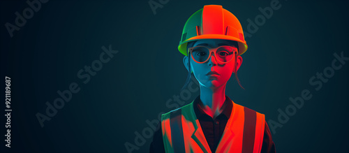 © chris3d, Obraz premium A construction worker dons a reflective safety vest and a hard hat, illuminated by dramatic red and blue lighting that highlights their commitment to safety - Generative AI