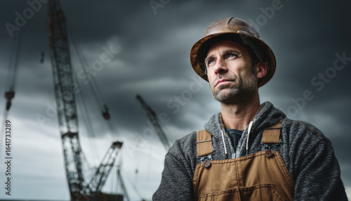 Fototapeta premium A construction worker gazes into the distance, wearing a hard hat and overalls, while cranes loom in the background under dark clouds