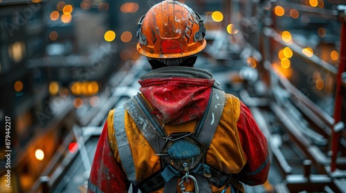 © svastix, Obraz premium A construction worker is seen from behind wearing safety gear at an active construction site. The image portrays the importance of safety, hard work, and dedication in the construction industry.