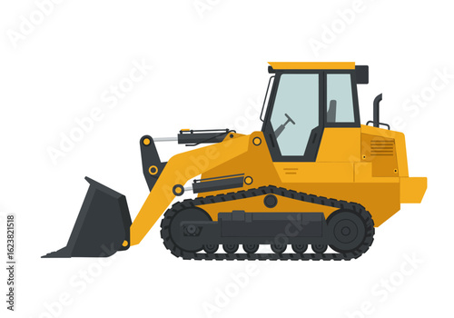 © X Vector, Fototapeta premium A constructionyellow bulldozer with black tracks and a bucket scooping in a flat graphical style