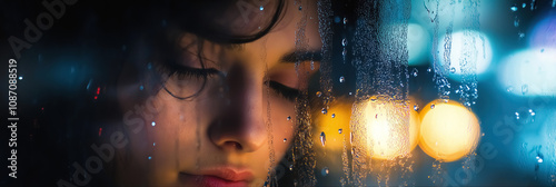 Obraz premium A contemplative woman gazing through a rain-streaked window at night