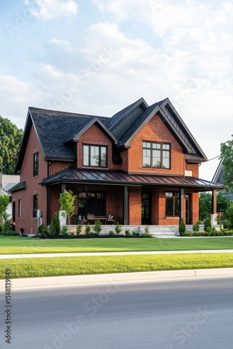 © gamespirit, Obraz premium A contemporary brick home featuring a stylish sloped roof sits within a beautifully landscaped yard in a peaceful suburban neighborhood, basking in the warm glow of the late afternoon sun