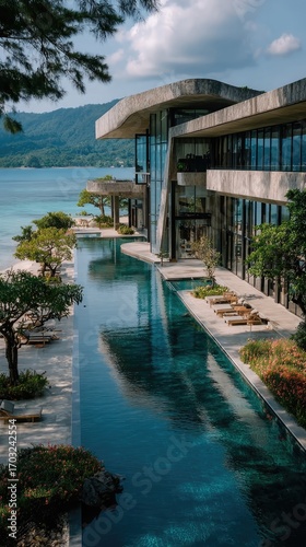 © Kasim, Obraz premium A contemporary concrete structure, perched on a tranquil coastal setting, features an expansive infinity pool reflecting the serene landscape and clear waters