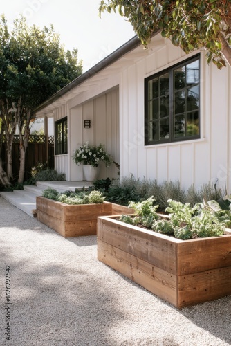 Fototapeta premium A contemporary garden featuring beautifully crafted wooden planters filled with lush, vibrant greenery is nestled next to a chic white house under the warm embrace of a sunny day