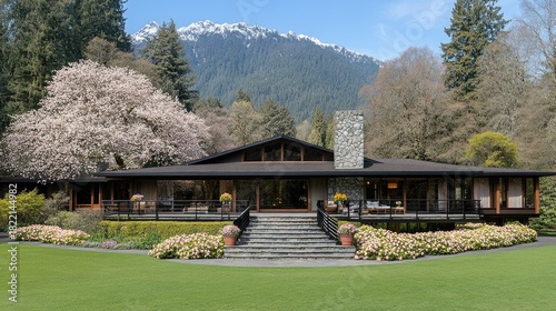 Naklejka premium A contemporary home features a stone terrace adorned with flower pots, large...