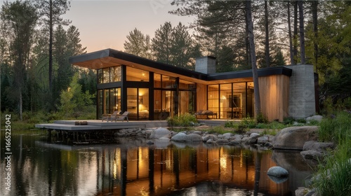 © Ilona, Obraz premium A contemporary house features extensive glass windows and a striking design, situated by a tranquil lake