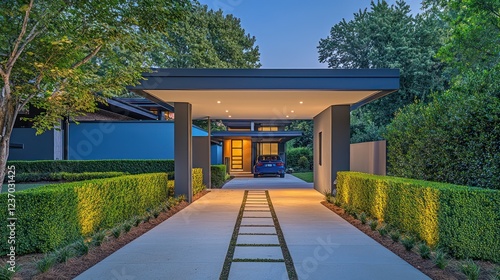© Nasreen, Fototapeta premium A contemporary house with a carport, painted in a duet of ash gray and electric blue