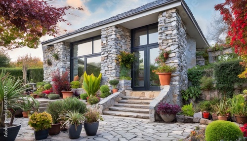 Obraz premium a contemporary house with a stone facade, surrounded by colorful gardens and potted plants, in a serene outdoor setting