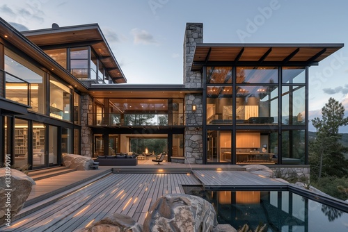 Obraz premium A contemporary retreat with a blend of natural stone and wood, expansive outdoor decks, and large windows offering stunning views of the surrounding landscape,