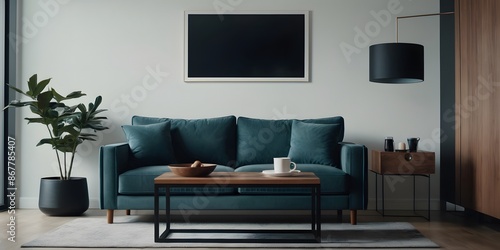 © disamirr, Fototapeta premium A contemporary room with a blank poster on the wall, featuring a plush sofa, wooden coffee table, and modern decor elements.