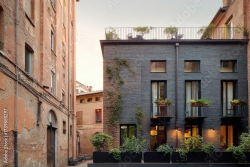 © gamespirit, Fototapeta premium A contemporary structure adorned with lush greenery stands out amidst a historic urban backdrop, illuminated by the warm hues of golden hour in a lively city