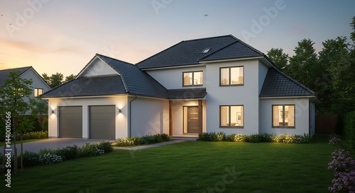 © Alvin, Obraz premium A contemporary two-story Gussek Haus model home with a dark roof and integrated two-car garage is softly illuminated at dusk, showcasing its clean lines and modern aesthetic.