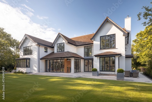Obraz premium A contemporary white house featuring expansive windows and a beautifully manicured lawn, set in a peaceful suburban neighborhood on a sunny afternoon