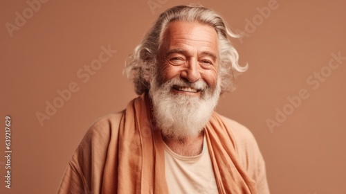 Fototapeta premium A contented elderly man with gray hair, donning natural clothes, smiling on a neutral background. Generative AI