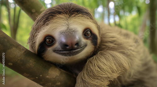 Fototapeta premium a contented sloth leisurely hanging from a tree branch, its slow movements echoing the tranquil pace of its rainforest habitat.