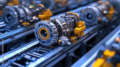 © Sampao, Fototapeta premium A conveyor belt transporting completed engines to the next stage in the factory.