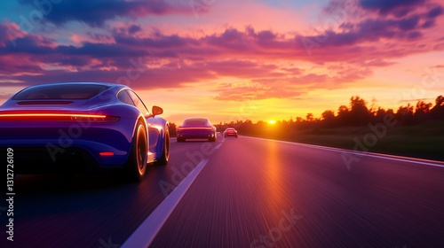 © Koplexs-Stock, Fototapeta premium A convoy of fast cars are traveling down an open highway