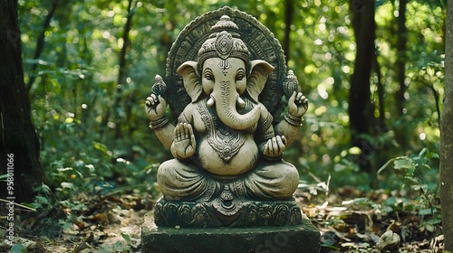 Fototapeta premium A cool Ganesha statue carved from stone, blending harmoniously with the natural beauty of the forest
