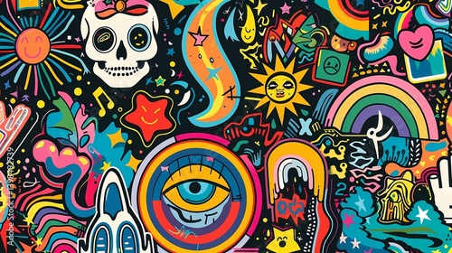 © Jbgoals, Naklejka premium A cool Groovy Stickers Background, Y2k Patches Collage, Pop Art Illustration Vector Design, Funky Pattern, Generative AI illustrations.