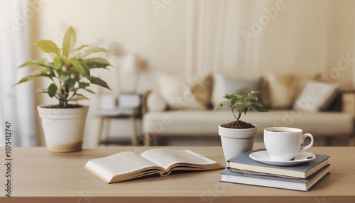 © zahidyounas, Obraz premium A copy space on a wooden desk features books, a coffee cup, and a potted plant in a living room. stock photo