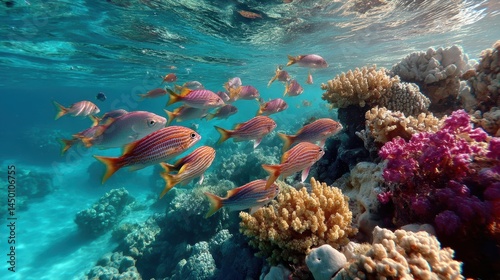 Naklejka premium A coral reef full of colorful fish and marine life seen underwater in clear...