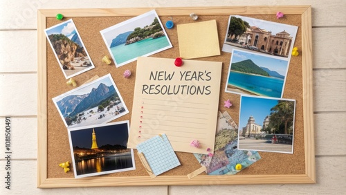 © Praewpyora, Fototapeta premium A corkboard filled with travel photos and a resolution note for the new year, highlighting personal goals and travel dreams