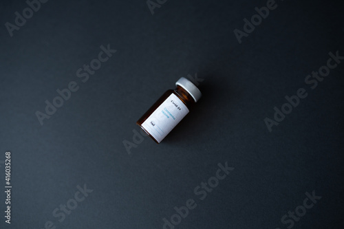 Naklejka premium A coronavirus vaccine dose vial, with a silver cap, on a black background. Health and epidemic control concept