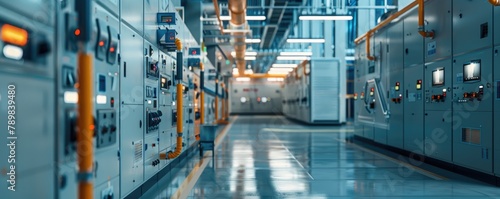 © Milan, Fototapeta premium A corridor in an industrial control room with high-tech equipment displays modern technological advancement and complex operations.