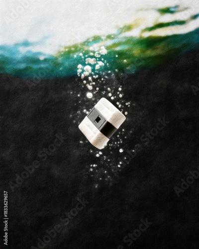 © kaliangpun, Fototapeta premium A cosmetic puff floats in water with bubbles and an abstract background. The image has a dark, moody aesthetic.
