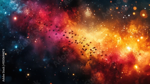 Naklejka premium A cosmic background with music notes, creating a connection between music and the universe.