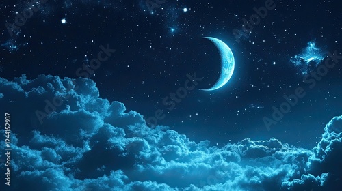 © Pannin, Fototapeta premium A cosmic dreamscape filled with dark blue and black tones, thousands of stars, and the mystic glow of moonlight shining through the clouds.