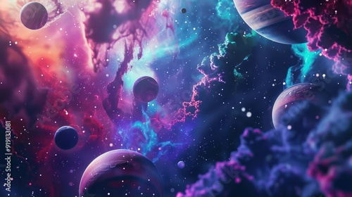 Naklejka premium A Cosmic Landscape with Planets, Nebulae, and Stars
