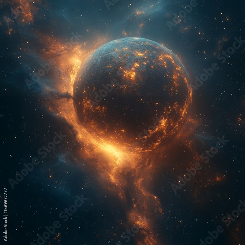 Fototapeta premium A cosmic sphere surrounded by fiery nebula and distant stars in a vast and...