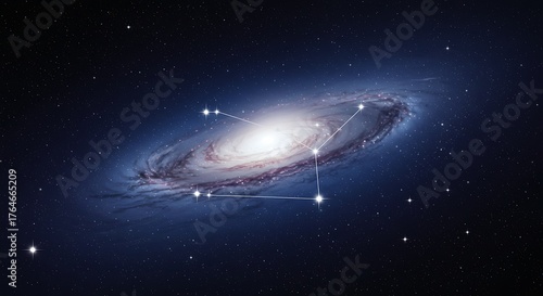 Obraz premium A cosmic spiral galaxy with bright stars and connecting lines against a deep...