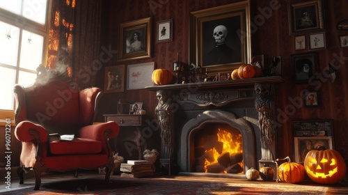 Naklejka premium A Cosy Halloween Interior with a Fireplace and a Carved Pumpkin