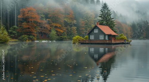 © visoot, Fototapeta premium A cottage with lake in the forest overcast. Generative AI.