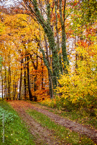 © gdefilip, Obraz premium A country road in a forest in Switzerland surrounded by colorful autumn trees and leaves