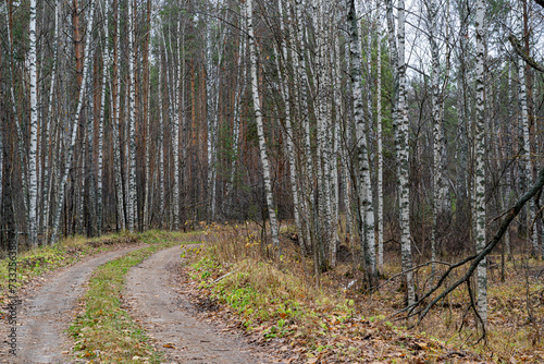 Fototapeta premium A country road in a pine forest in autumn.