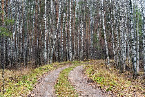 Fototapeta premium A country road in a pine forest in autumn.